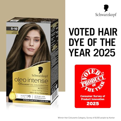 Schwarzkopf Oleo Intense Permanent Oil Colour 5-10 Light Brown Hair Dye, 100% Grey Coverage, Conditioner with HaptIQ System, Long-Lasting Colour, Ammonia Free Hair Dye