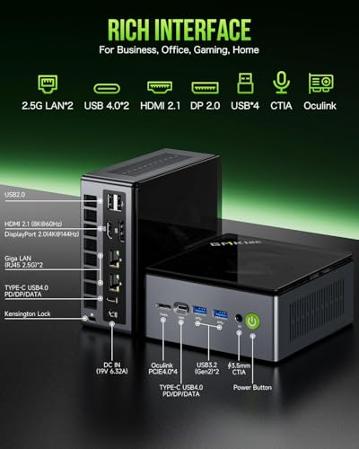【Oculink Port】 The M7 Ryzen 7 Mini Gaming PC Oculink port enables higher bandwidth capabilities, better frame rates and lower lag. The standard also operates at PCIe x4 speeds, compared to Thunderbolt’s x3. Gamers and content creators can benefit from OCuLink’s higher bandwidth, resulting in better performance and lower lag for eGPU setups.