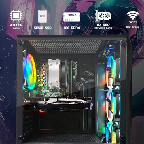 STGsivir Gaming PC Desktop, Gaming Computer Tower, RX 580 8G, AMD 3000G 3.5GHz, 16GB DDR4 RAM, 512GB SSD, 600M WiFi, BT 5.0, Black RGB Gaming Case, Windows 11