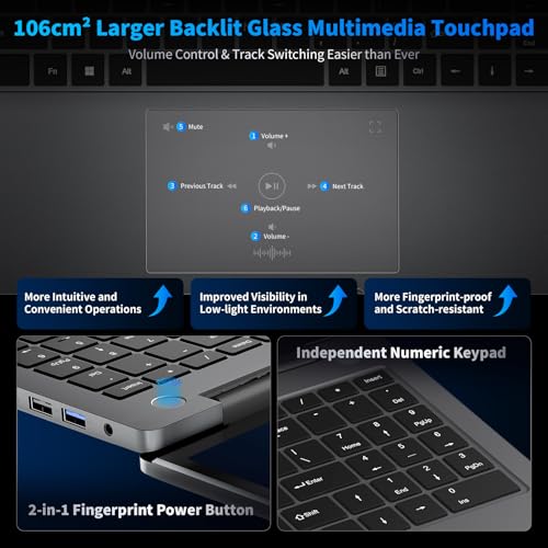 MULTIMEDIA TOUCHPAD AND BACKLIT KEYBOARD:The computer laptop is equipped with a 5.2-inch high-quality glass touchpad that supports multi-finger gesture operation, soft and warm touch, and spacious workspace, bringing you a more intuitive and seamless interactive experience. The multimedia touchpad is powerful, and you can easily control the volume and switch tracks with one click, allowing you to operate freely in a dim environment, convenient and efficient. The independent numeric keypad and fingerprint power button design not only improves work efficiency, but also ensures safe use.
