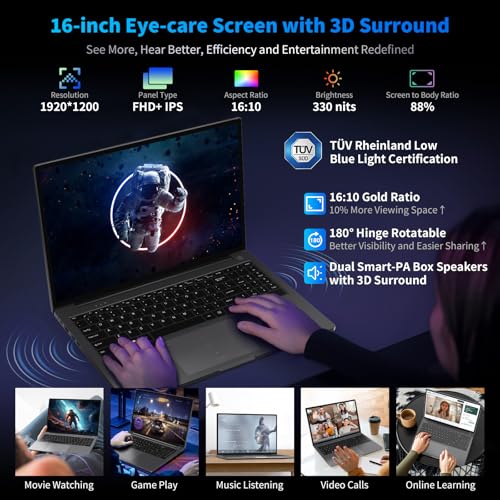 16-INCH LARGE SCREEN HD ANTI-BLUE LIGHT:Acebook 12 laptop is equipped with a 16-inch large FHD+ IPS screen, 1920×1200 HD resolution, vivid and accurate colors, clear and precise image details. Gaming laptop screen adopts a 16:10 ratio, which can display 10% more vertical content than ordinary screens. 180° gravity hinge design, TÜV low blue light certification, eye protection and comfort, suitable for long-term office and entertainment, providing a wider field of view and delicate picture details.