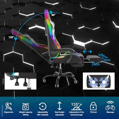 Devoko LED Gaming PC Chair with Footrest and Lumbar Support, Ergonomic Computer Massage Gaming Chair, Video Game Chairs for Adults, High Back Racing Chair, Maximum capacity 180kg (Black & White)
