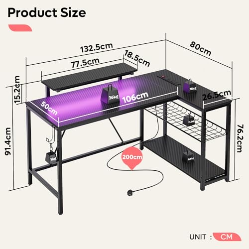 Bestier 132.5 cm L-Shaped Workstation with Carbon Fibre Surface, 3 Power Outlets & 2 USB Ports, LED Strip Lights – Reversible Corner Unit with Shelves & Hooks for Home Office & Gaming