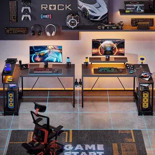 Carbon Fiber Gaming Desk: The corner gaming desk features RGB Strip Lights under the monitor shelf. Choose from 7 main colors and up to 22 display modes for an immersive gaming experience. Create a special atmosphere for gaming or enjoy exciting movies with a unique ambiance at home