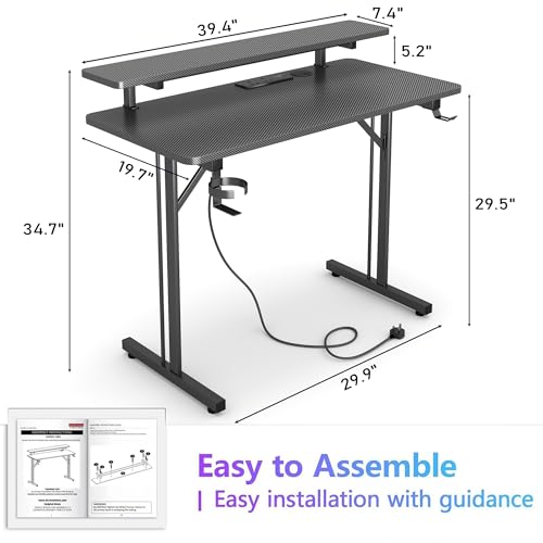 CAIYUN Gaming Desk, 100 x 50 cm Computer Desk with LED Light Strips & Power Outlets, Office Desk with Full Monitor Stand Carbon Fiber Black