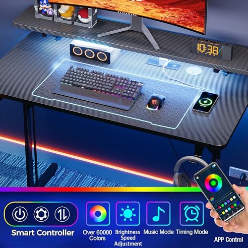 Sleek Carbon Fiber Design & LED Light Strips:The carbon fiber desktop offers a modern, stylish look while being easy to clean. The integrated LED lighting around the table creates an immersive gaming experience, perfectly complementing your gaming setup, keyboard, and overall aesthetic. With multi-color and multi-mode options, the high-quality LED strips elevate your gaming accessories. Conveniently control the lights via remote for a personalized lighting ambience