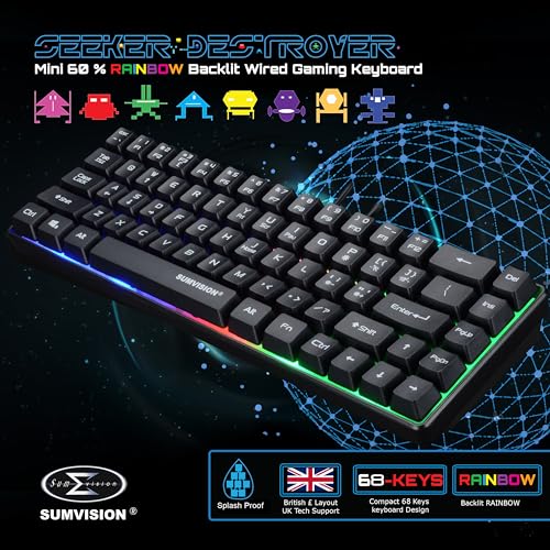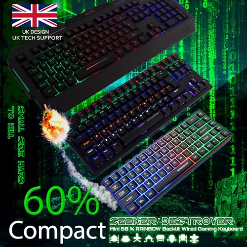 PC Gaming Keyboards SUMVISION SEEKER DESTROYER 60% Percent Pro Gaming Keyboard Wired USB Mini Compact Backlit Mechanical Feel Apple Mac Windows 11 PC PS5 Xbox Series X/S (FREE UK TECH SUPPORT)