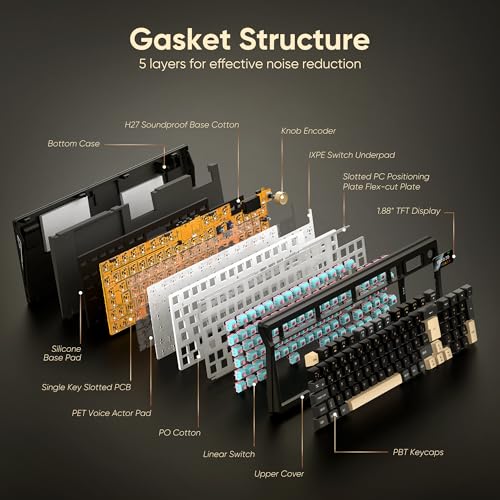 【Gasket-Structure Five-layer Noise Reduction】K95 has a five-layer sound insulation and shock absorption internal design, which adopts Poron silencing cotton, IXPE switch pad, PET sound enhancement pad, PCB single-key grooves and bottom silicone pad. The advanced internal gasket structure eliminates most of the noise and resonance of the keyboard, ensuring the purest sound and soft and smooth typing experience every time you press the key.