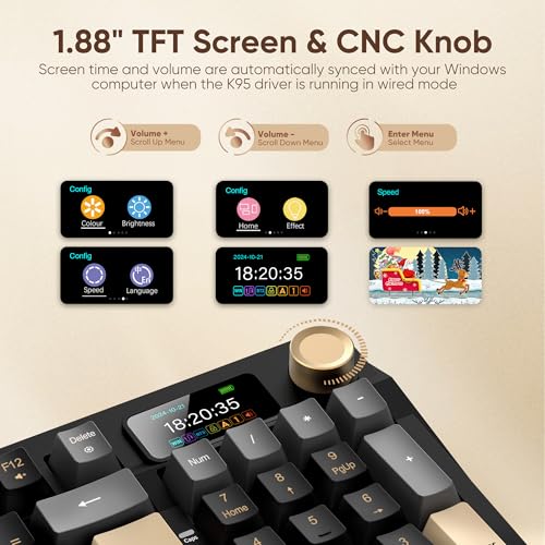 【Customizable Smart TFT Screen & CNC Knob】K95 Gaming Keyboard has built-in intelligent TFT color display screen, which can be used as an interactive interface for real-time updating and customization. The high-definition display screen can realize custom Gif image, date and time, battery status, backlight effect and connection mode, WIN/MAC, and the Control Knob allows quick adjustment of complex functions: volume adjustment and lighting adjustment, screen control. Real-time updates are within reach.