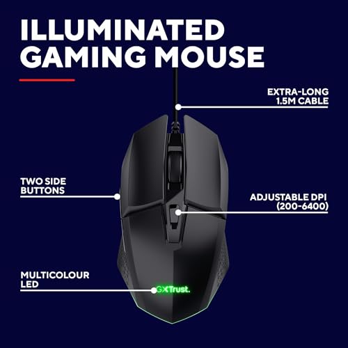 Trust Gaming GXT 109 Felox Gaming Mouse with 6 Programmable Buttons, Advanced Software, Multicolour LED Lighting, 200-6400 DPI, 1.5m USB Cable, RGB Computer Mouse for PC, Laptop, Windows – Black