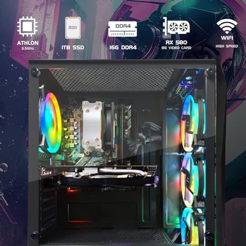 STGsivir Gaming PC Desktop Computer Tower, RX 580 8G, AMD 3000G 3.5GHz, 16GB DDR4 RAM, 1TB SSD, 600M WiFi, BT 5.0, Black RGB Gaming Case, Windows 11
