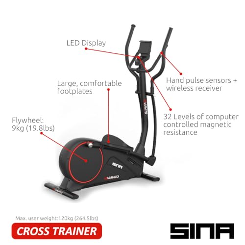 The Viavito Sina elliptical cross trainer is a stylish machine featuring a 9kg (19.8lbs) flywheel for smooth and quiet operation and has a stride length of 38cm (15″). Offering large, comfortable footplates and fixed and moving handlebars, the cross trainer guarantees enjoyable and effective, low-impact cardiovascular workout sessions. It integrates a dual colour backlit LCD display with KM/MI switch and has a wide selection of 20 programmes to keep you challenged and motivated. There are 32 levels of computer controlled magnetic resistance to let you adjust workout intensity and 4 user profiles. Heart rate measurement can be achieved through the hand pulse sensors or a wireless receiver with an optional chest strap.