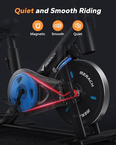 SAFER AND QUIETER: Unlike inferior exercise bikes with iron sand flywheels, the MERACH exercise bike uses cast iron flywheels that do not cause problems such as loud noises or damaged pulleys. The ‘new magnet system’ with industrial ball bearings and ABS pulleys ensures that the noise level of the movement mechanism does not exceed 30 dB. The adjustment knob allows a resistance range of 0-100 to provide a comfortable indoor cycling experience.