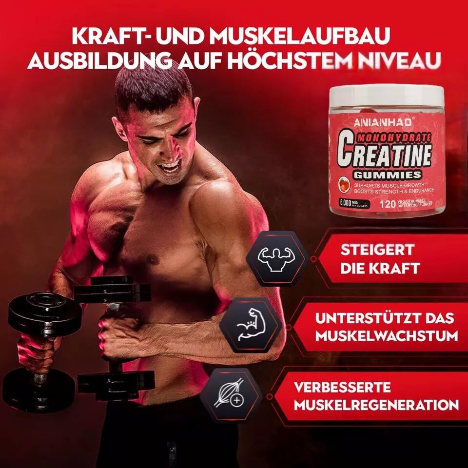 HIGH-POTENCY MUSCLE GROWTH SUPPORT Each serving delivers 6000mg of creatine monohydrate gummies to enhance muscle growth and strength for both men and women.
