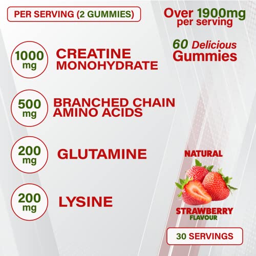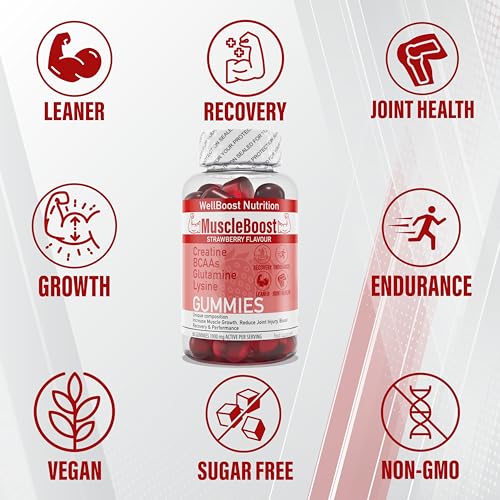 MuscleBoost Gummies – Creatine, BCAAs, Glutamine & Lysine – Muscle Growth, Recovery & Endurance Support – Vegan, Sugar-Free, Strawberry Flavour – 60 Chewable Gummies for Adults