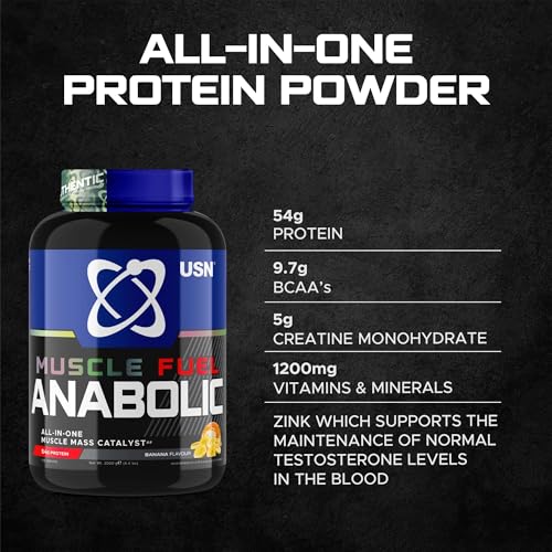 USN Muscle Fuel Anabolic All-In-One Muscle Mass Gainer, Banana Flavour – 2kg, 54g Protein Powder, 5g Creatine Powder & 5g BCAA Powder For Maximum Muscle Growth, Post Workout Recovery Drink Mix