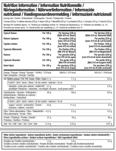 Maltodextrin, Protein Blend (36%) (Whey Protein Concentrate [MILK], Calcium Caseinate [MILK], EGG Albumin, Whey Protein Isolate [MILK], Whey Protein Concentrate Hydrolysate [MILK]), Creatine Monohydrate (1%), Flavourings (MILK), Colour (Calcium Carbonate), Emulsifier (Lecithins [SOY]), Thickener (Guar Gum), Sweeteners (Acesulfame K, Sucralose), Medium Chain Triglyceride Encapsulate (Medium Chain Triglycerides [Palmkernel Oil], Glucose Syrup, MILK Protein, Stabilizer [Potassium Phosphates], Anti-Caking agent [Calcium Phosphates]). Allergens: See ingredients in BOLD.