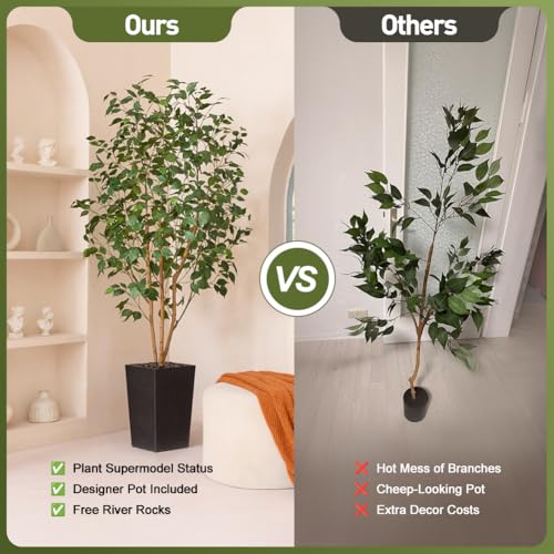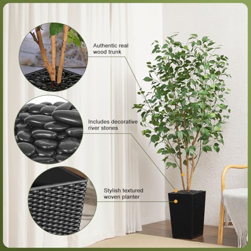 Customizable & Adjustable: With adjustable branches, you can shape this artificial ficus tree to fit your space perfectly. Place it in the included black plastic pot or enhance it with a decorative planter for a unique touch. The 2kg river rocks in the pot provide added stability, ensuring the tree stays secure, whether placed in your home, office, or garden