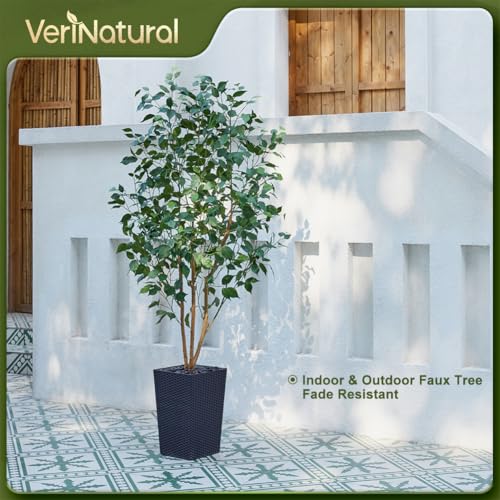 VeriNatural Artificial Ficus Tree 180 cm – Lifelike Fake Plant with Real Wooden Trunk, Green Silk Leaves – UV Resistant Faux Tree with Black Taper Planter for Home Indoor and Outdoor Decoration, VN129