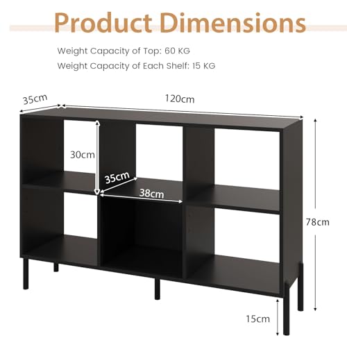 CASART 4/6-Cube Wooden Bookcase, 3 Tiers Open Bookshelf with Adjustable Shelves, Metal Legs & Anti-Topping Device, Freestanding Display Shelf for Living Room Bedroom Study (Black, 120 x 35 x 78cm)