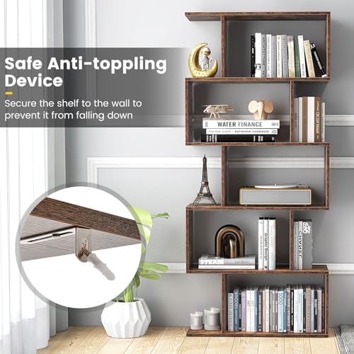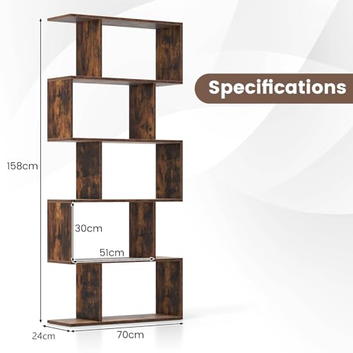 CASART 5/6 Tier Wooden Bookcase, Free Standing Shelving Stand Rack, S-Shaped Bookshelf Storage Display Unit (Brown,70 x 24 x 158cm)