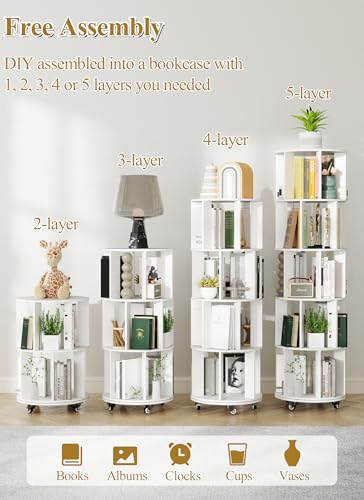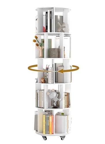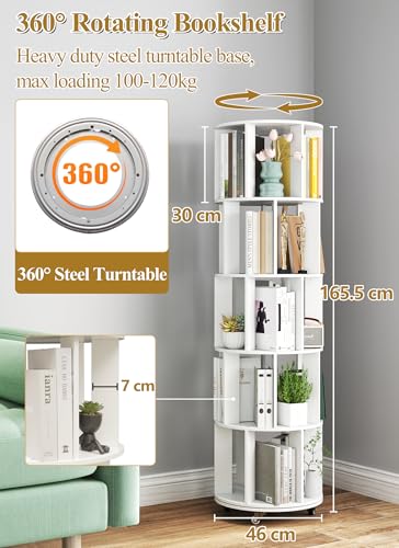 Rotating Bookshelf 4-tier corner bookcase 360° Revolving bookcase Rotating bookshelf tower with 4 castors 46 x 46 x 132 cm (White| 5-Tier| With wheels, 46 x 46 x 165.5cm)