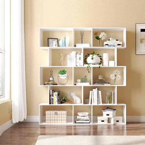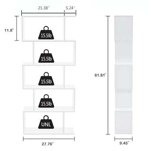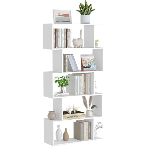 Yusong Bookshelf 5-Tier, Geometric Bookcase S Shaped Book Shelves for Bedroom, Modern Wood Decorative Display Shelf Book Case for Home Office, White