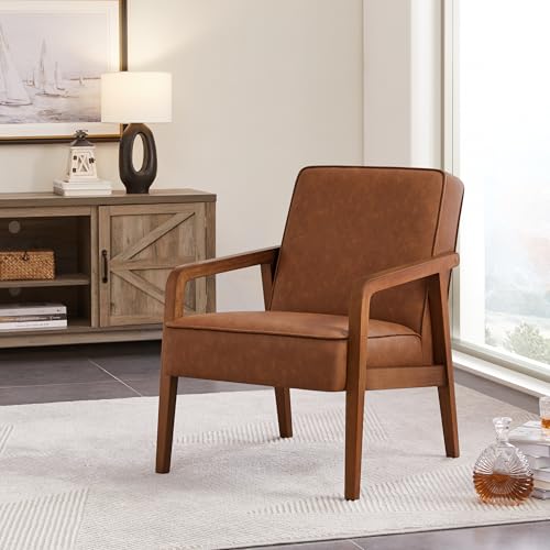 Mid-century Modern Vibe: The streamlined silhouette and sculptural wood legs of this living room chair strikes a subtle mid-century modern style. Faux leather upholstery resembles the unique appearance of crazy horse leather, lending a touch of retro elegance to your home. No tufted trims keep the silhouette more sleek