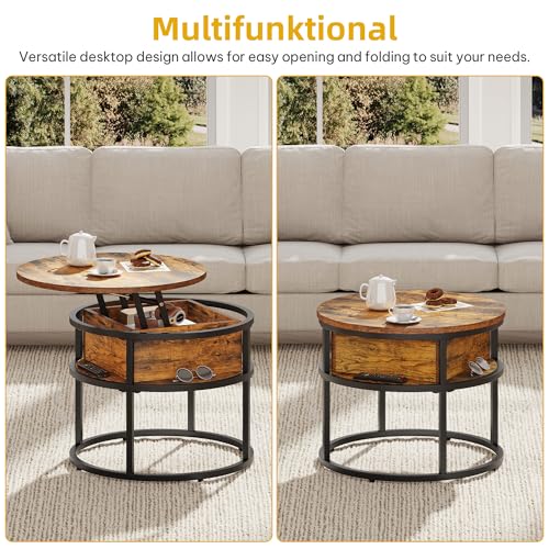 DWVO Lift up Coffee Table for Living Room, Small Coffee Tables with Lift Top, 60x60x47cm, Coffee Table Round with Metal Frame and Hidden Storage