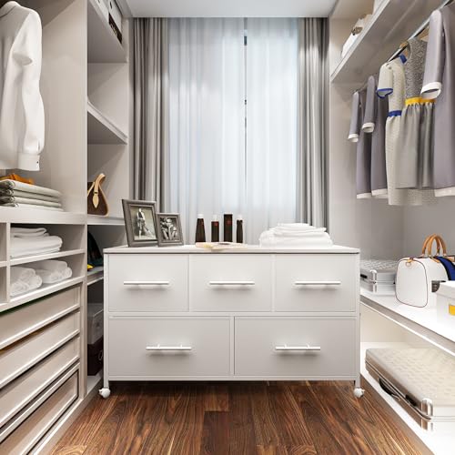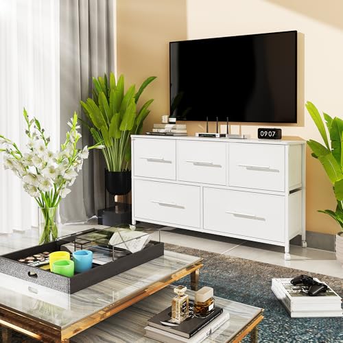 MYGIIVOVO Chest of Drawers, Dresser for Bedroom with 5 Fabric Drawers, TV Stand with 4 Castors, Storage Organizer Unit for Living Room Kids Room (White)
