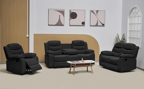 Modern Fabric Manual Recliner Sofa Set – 3+2+1 Seater Suite For Living Room With Dropdown Table & Cup Holders (Black, 3+2+1)
