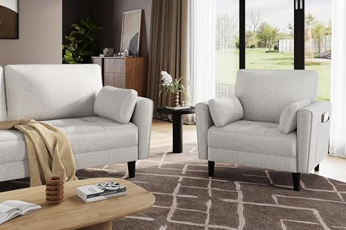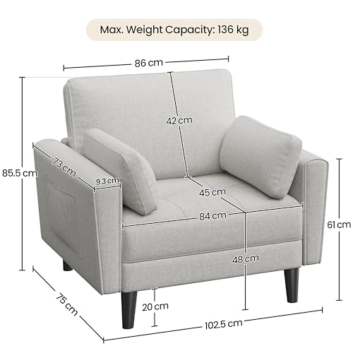 Yaheetech Modern Single Sofa Fabric 1 Seater Sofa Small Couch with 2 Pillows Lounge Sofa Set for Living Room Study Bedroom Polyester Fabric Greige