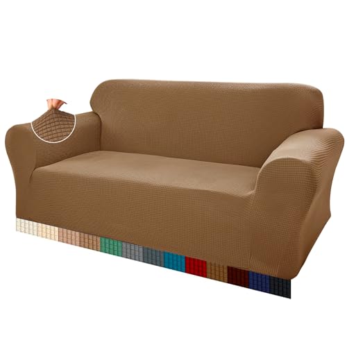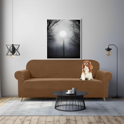 Teynewer High Stretch Sofa Covers 3 Seater Super Soft Stylish Couch Covers for Dogs Pets Cats Jacquard Spandex Non Slip Sofa Slipcover for Living Room Furniture Protector (3 Seater, Camel)