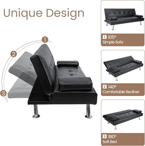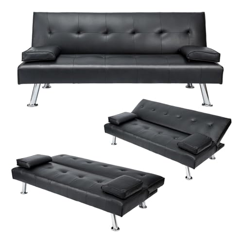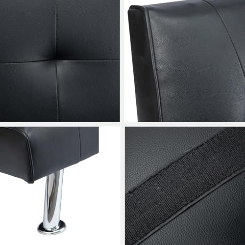 CROWNSHOP 3 Seater Sofas Modern Sofa Beds with Upholstered Convertible Sofas & Couches Couch Adjustable Angle Sofas with Metal Legs for Living Room/Spare Room/Guest Room Black PU Leather