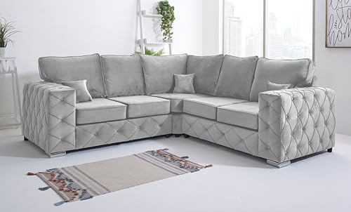 Sofahub Milton Silver Plush Velvet Living Room Sofa Set – Button Tufted Design with Foam Seats & Chrome Feet | 2 Seater, 3 Seater, 3+2 & Corner Sofa Options – Fullback Sofa (Silver, Corner Sofa)