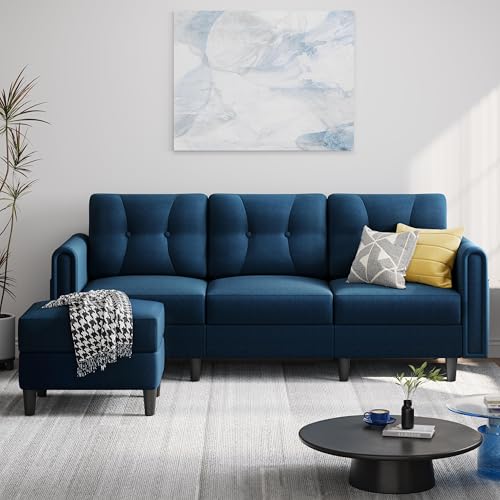 Yaheetech Fabric Sectional Sofa with Ottoman, L-shaped Sofa Couch with Side Pockets or Small Spaces, Reversible 3-Seater Chaise Lounge for Living Room, Home Office, Velvet Fabric, Blue