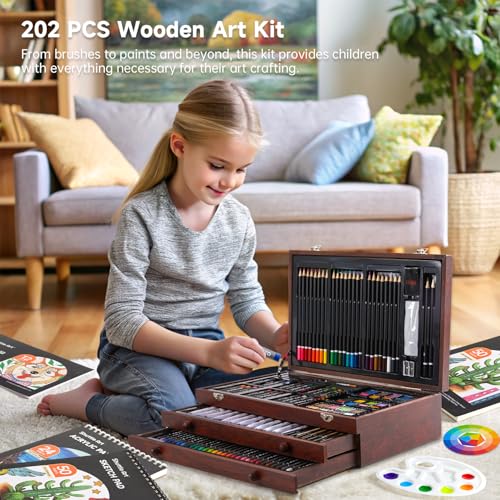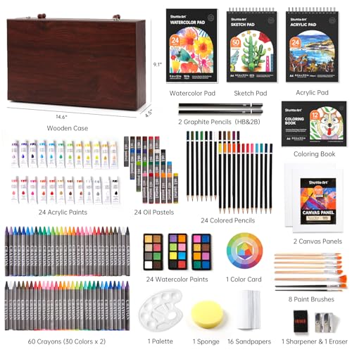 Shuttle Art 202-Piece Art Set for Kids, Deluxe Art Supplies with Acrylic Paints, Crayons, Oil Pastels, Colouring Pencils, Watercolour Paints, Wooden Painting Set for Artists, Beginners-Cheery