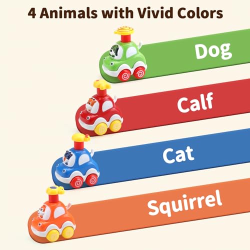 【Nice Cartoon Car Toy Set】 4 adorable colourful car toys with funny face, including calf, puppy, little squirrel, little cat. Children will be attracted by the cute cartoon picture. Perfect for 1-3 years baby.
