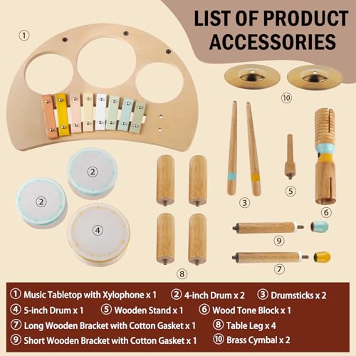 Neutral Colors Wooden Baby Toys:All the materials and colors of our montessori toys come from nature.These montessori wooden toys can keep baby focused and calm,improving children’s concentration. An all-in-one musical instrument featuring 3 drums, 2 drumsticks, 2 cymbals, a sound block and a xylophone. Have 4 stable legs, allowing children to easily play tunes or tap rhythms.