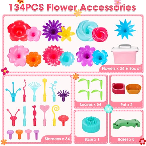 Fivejoy Flower Garden Building Toys for 3 Year Old Girls Boys,134pcs Flower Building Toy – Floral Arrangement Playset With Suitcase, Flower Building Blocks Set