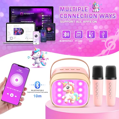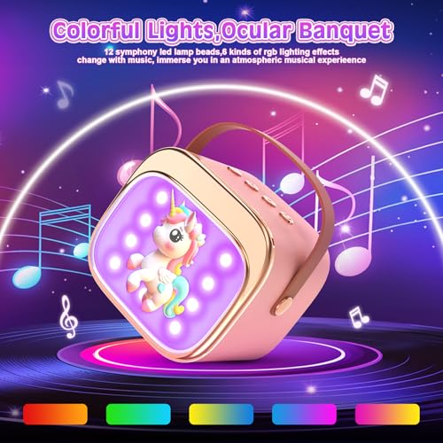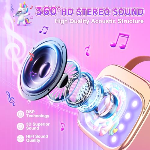 【Hi-Fi Sound Quality & Dual Wireless Mics】Our Unicorn Kids portable Bluetooth karaoke machine for girls features a DSP chip and 360° surround sound technology, delivering crystal-clear Hi-Fi audio for kids toys.Our karaoke machines deliver clear, low-distortion sound and powerful audio output for the perfect karaoke experience.Perfect for nurturing musical talent in 3-12 year old girls.