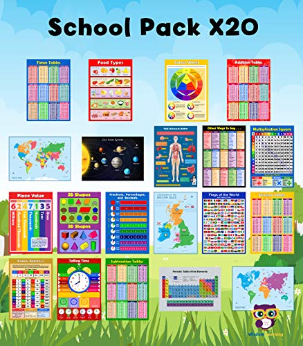SCHOOL 20 x EDUCATIONAL GLOSSY POSTERS for Children, Primary, Junior, Classroom Wall Chart Learning Childrens Set Pack – Day care, Home schooling. Times Tables, Learn Time, Shapes, Planets