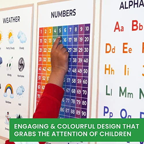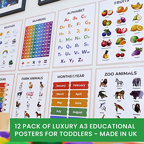 EDUCATIONAL POSTERS: Our premium educational posters for children are perfect for giving your toddlers a flying start with their learning. This 12 pack includes: Alphabet, Numbers 1-100, Days of the Week, Months of the Year, Weather, Colours, Shapes, Farm Animals, Zoo Animals, Fruits, Vegetables & Transport