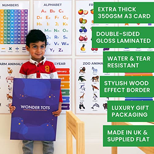 Wonder Tots Premium Educational Posters for Toddlers – Alphabet ABC, Numbers, Shapes & More – Kids Learning Posters for Children, Early Years Nursery Decor, Preschool Wall Charts (12 Pack)