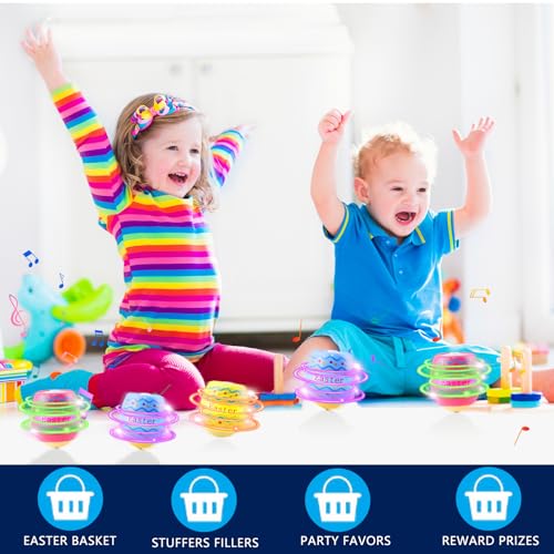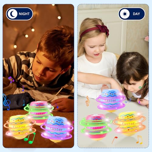 COOL LIGHTS AND MUSIC: Each easter spinning top has 4 LED lights on top, which are at different heights and staggered; when the gyro egg rotates on the ground the colourful lights automatically light up and the music plays automatically. When the rotation stops, the music and lights also stop.