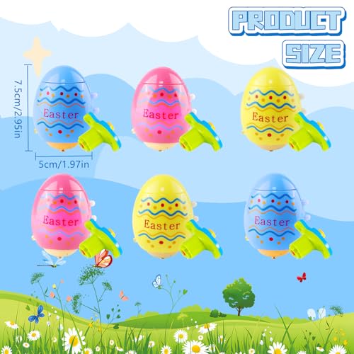 6 NOVELTY GYRO EGGS: The easter egg hunt kit has a total of 6, blue, yellow, pink each 2, rich pattern. Attract children’s attention and loved by them.