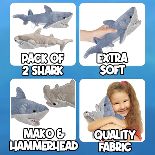 Bedwina Mako & Hammerhead Shark Plush Stuffed Animal Toys – Pack of 2, 35cm (14in) & 33cm (13in), Kids’ Toys, Ages 3+