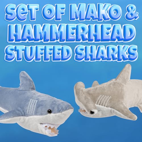 AWESOME! SET OF MAKO & HAMMERHEAD STUFFED SHARKS: Each set includes a hammerhead shark plush that measures 13 inches and a Mako Shark Teddy that measures 14 inches in length. The Mako shark can be found in temperate and tropical seas all over the globe. Hammerhead Sharks are ferocious predators that hunt and tear apart their prey with their sharp teeth!