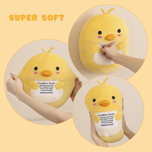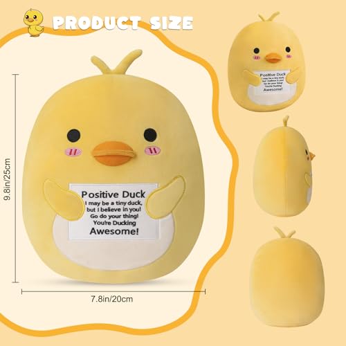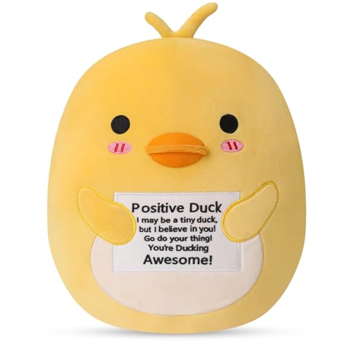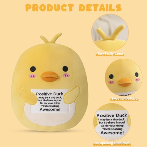 Unique Design: Adorable positive emotion duck plush, no one can resist his charm. Fun emotional support duck comes with an encouraging message card, sure to bring a smile to your face. All bad emotions and work stress will disappear when you embrace positive plushies